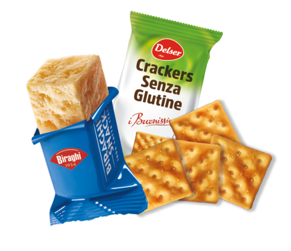 Ideale per chi segue una dieta gluten free o presenta intolleranze, questa combinazione include un Biraghino Snack da 16,67g e quattro crackers Delser: una merenda leggera, equilibrata e senza rinunce. •