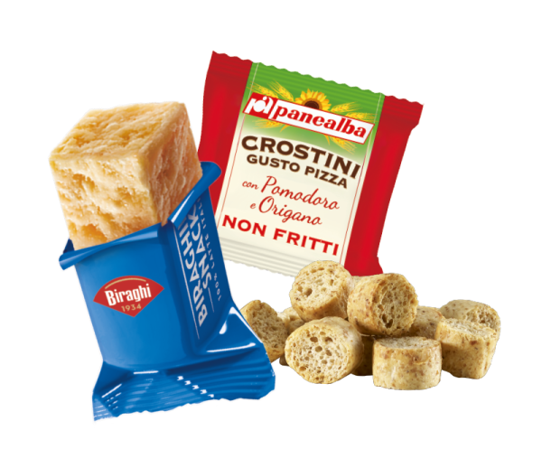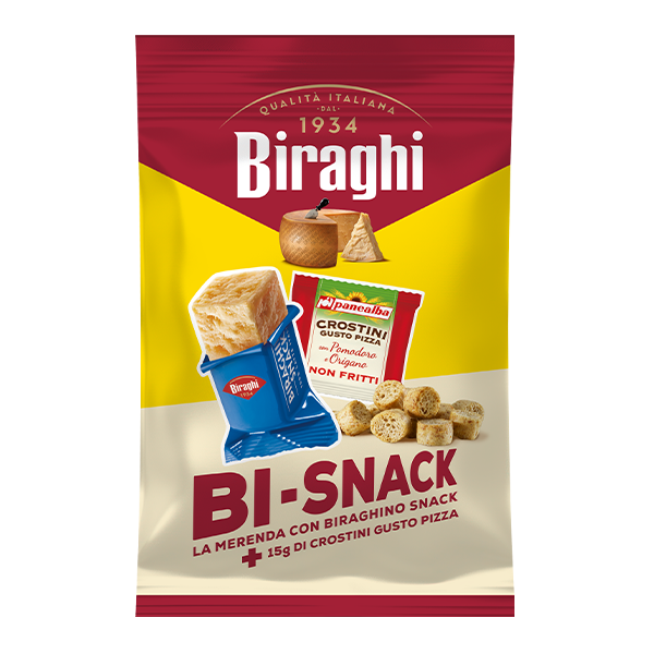 Una proposta salata e sfiziosa, che abbina un Biraghino Snack da 16,67g a 15g di croccanti Crostini al gusto pizza Panealba. Ideale per chi vuole concedersi una pausa ricca di sapore.