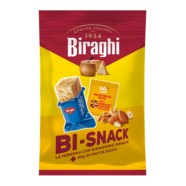 Unisce un Biraghino Snack da 16,67g a 20g di mix di Frutta secca selezionata Life, per uno snack sano e naturalmente energetico, perfetto per chi cerca benessere con gusto.